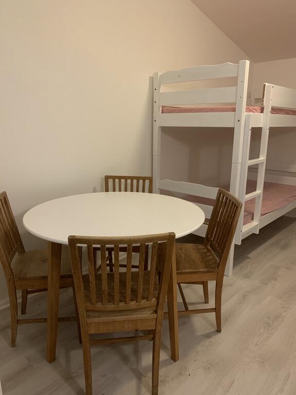 I vandrarhemmet erbjuder vi boende i 4-bäddsrum. Rummen ligger i två separata fristående byggnader med 5 rum i varje. Varje rum har två våningssängar, matbord, handfat och kylskåp med frysfack.